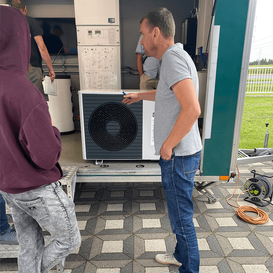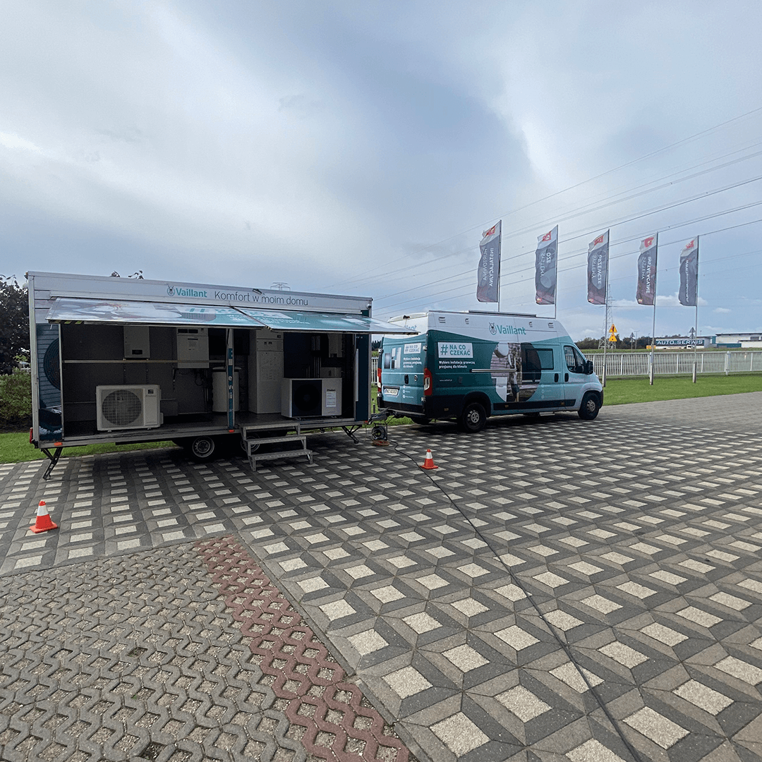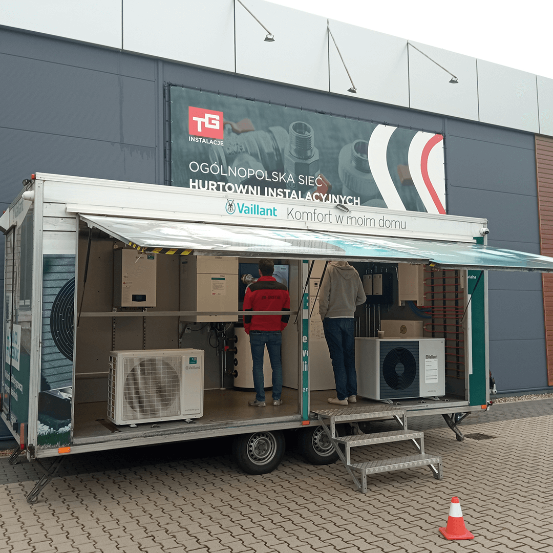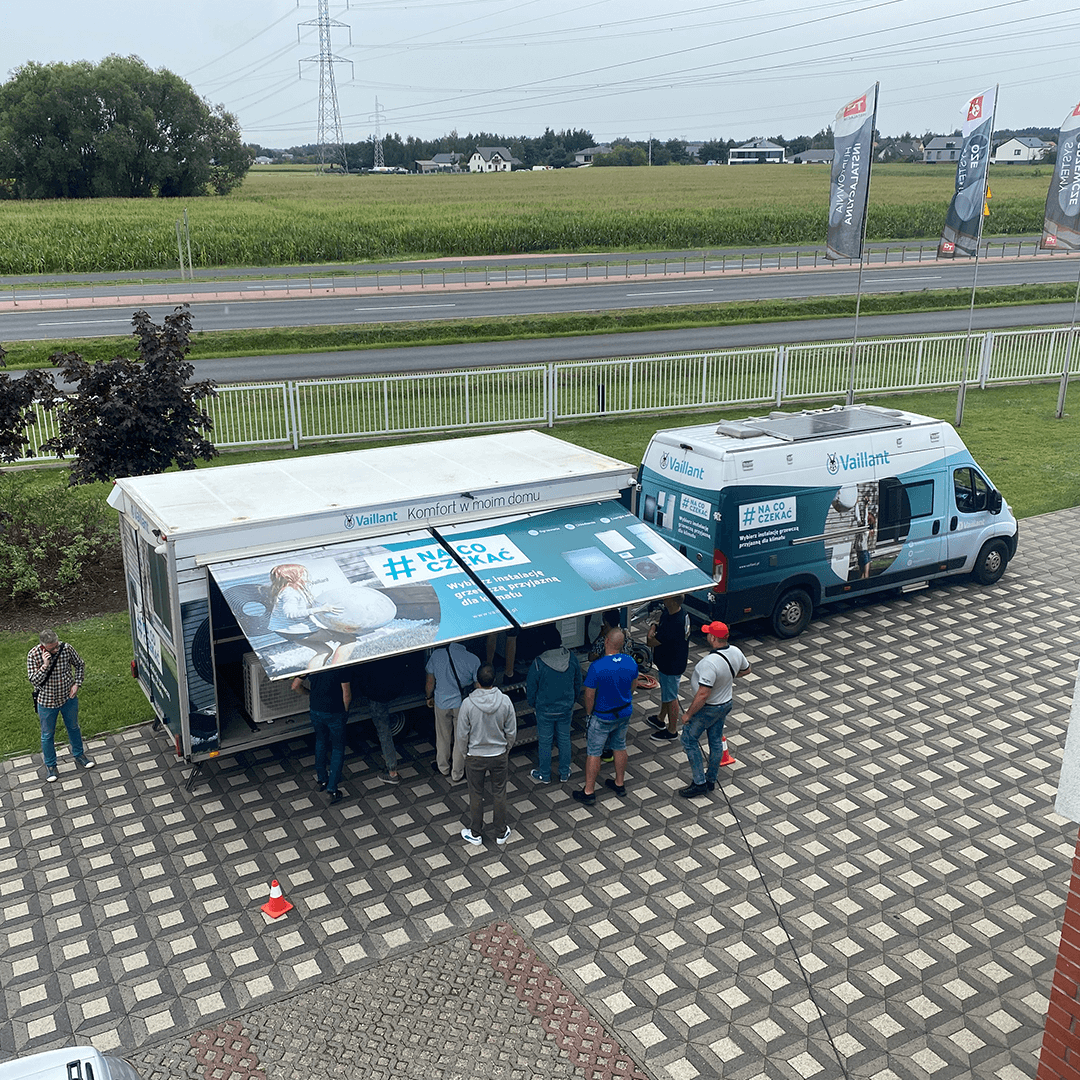 Kolejnym etapem była część praktyczna, która odbyła się w specjalnie wyposażonym infobusie Vaillant. Znajdująca się w nim działająca, w pełni wyposażona instalacja pompy ciepła, umożliwiła uczestnikom zgłębienie wiedzy na temat prawidłowego montażu, przeglądu oraz serwisu pomp ciepła Vaillant.